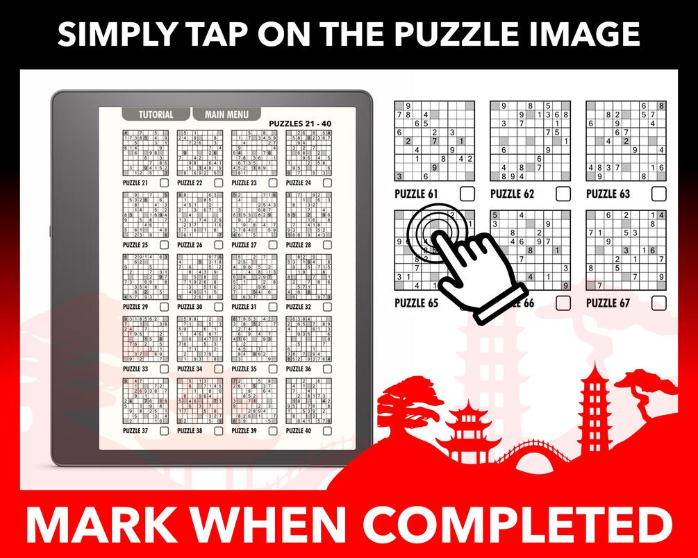 Each puzzle has matching solution file which you can use to check your answer or help if you are stuck by tapping on the SOLUTION tag on top of each puzzle page. BACK will get you back to the puzzle origin.